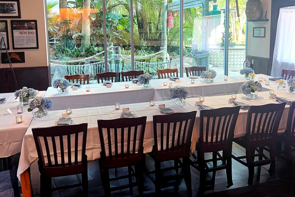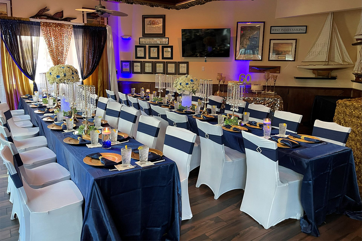 The Rum Room celebrates Pusser’s Caribbean roots and 300 years as the British Royal Navy’s official rum. This private space features deep mahogany accents, a coffered ceiling, sailing memorabilia, and an antique rum still. A mounted 55” smart TV is ideal for presentations or slide shows. At 450 sq. ft., the room comfortably seats up to 46 guests but can also be tailored for seminars or more intimate gatherings.